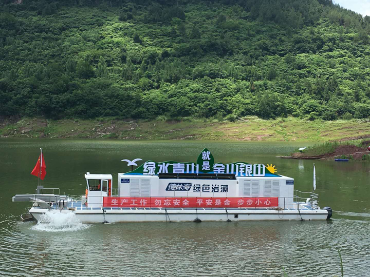 公司研發(fā)的加壓控藻船,以玻璃鋼船體為平臺,配置藍藻打撈、壓力控藻和曝氣裝置...